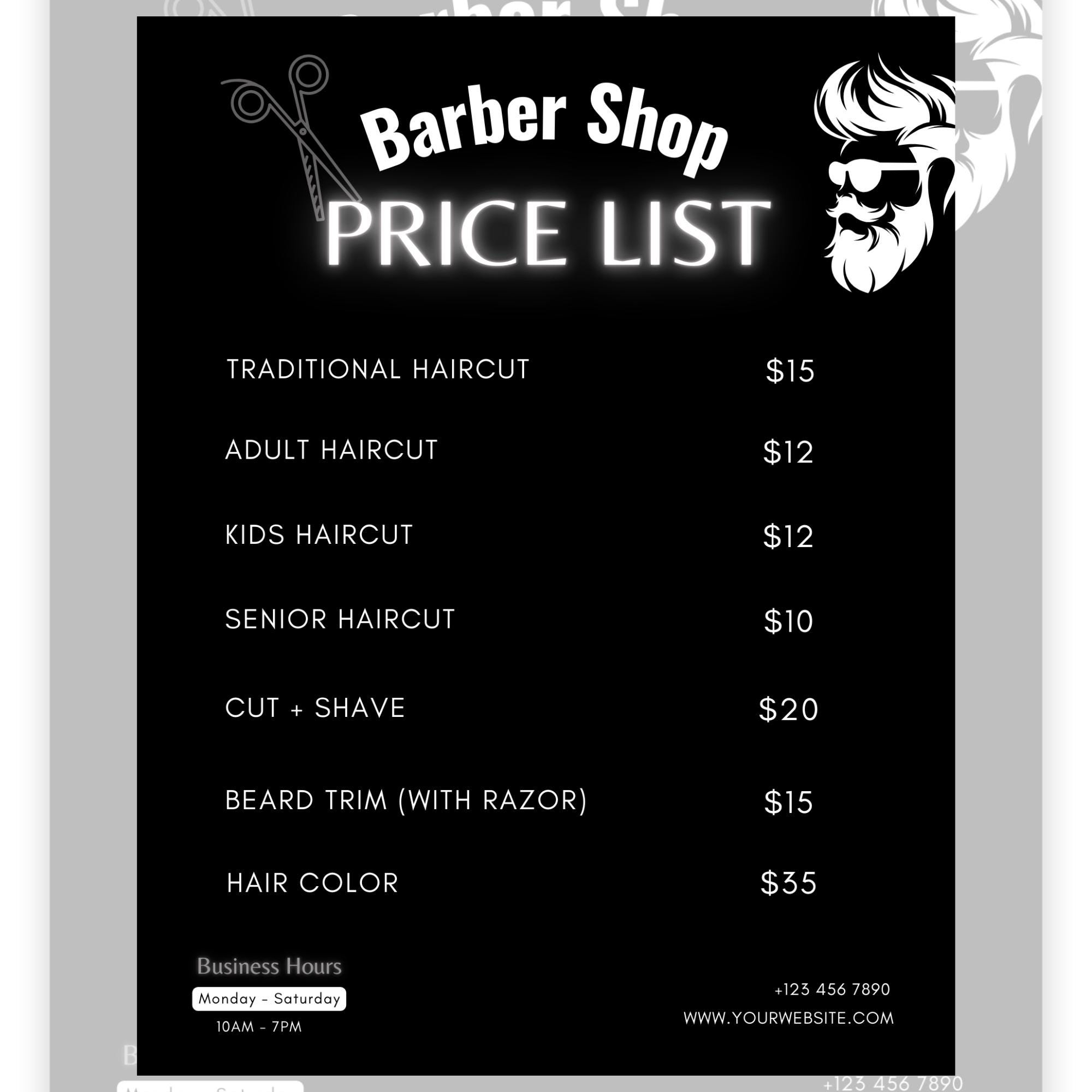 Our template allows you to easily customize your prices to suit your business needs. Whether you offer haircuts, shaves, beard trims, or other services, you can input your prices and update them as needed. It’s simple, straightforward, and best of all, free!