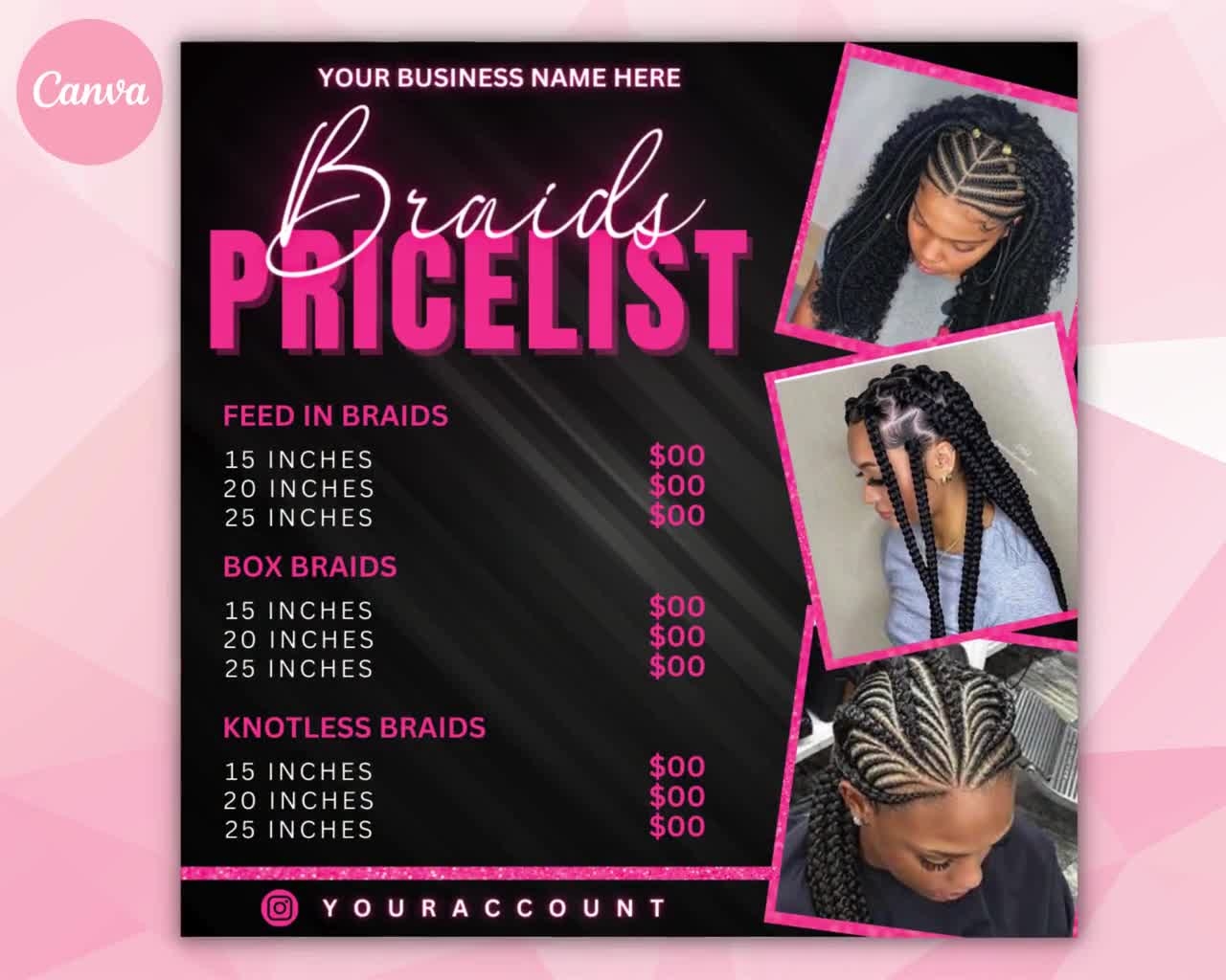 Price List Template Editable Hair Dresser Pricing Template Design braids Makeup Canva Template Braid Pricelist Etsy