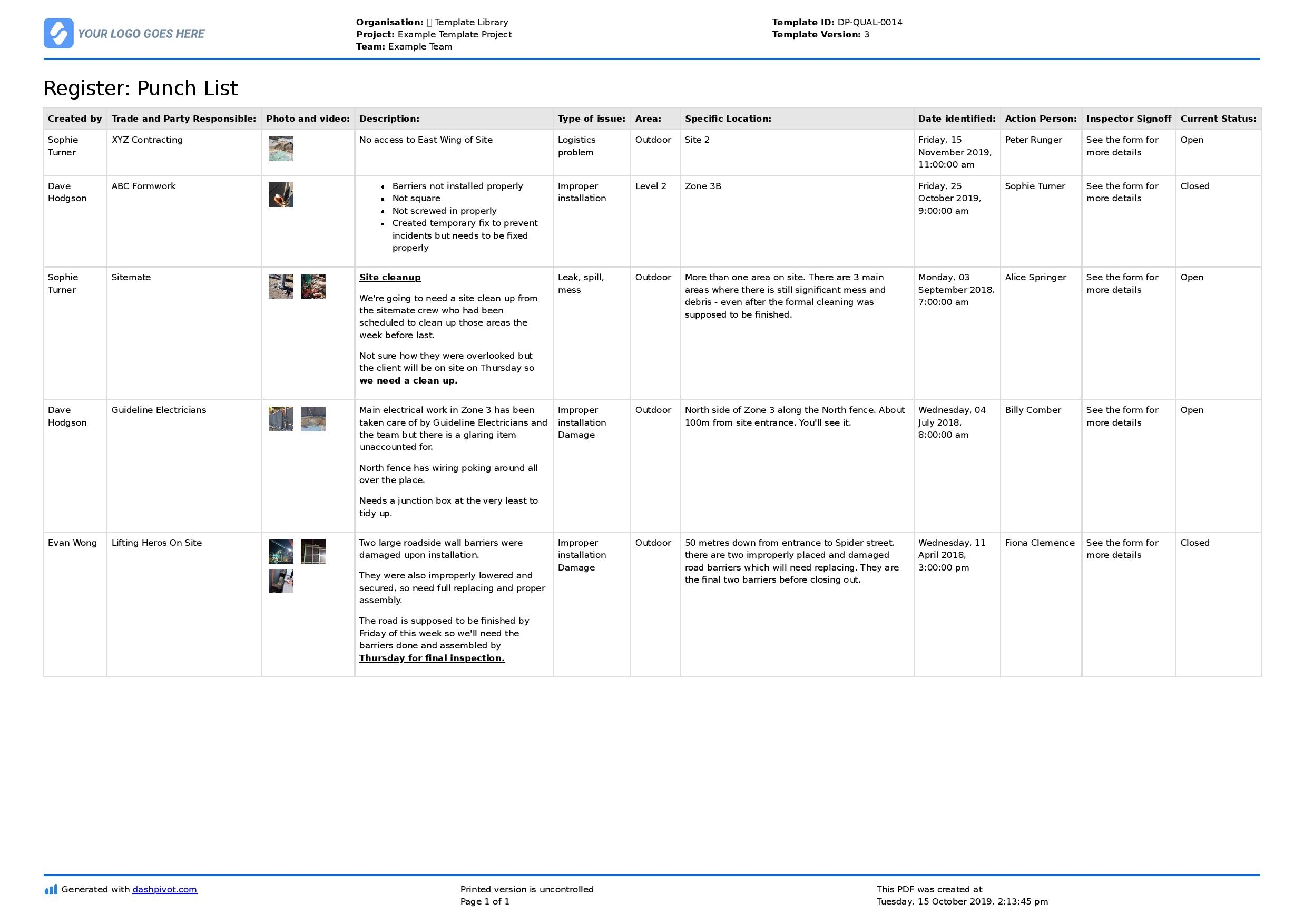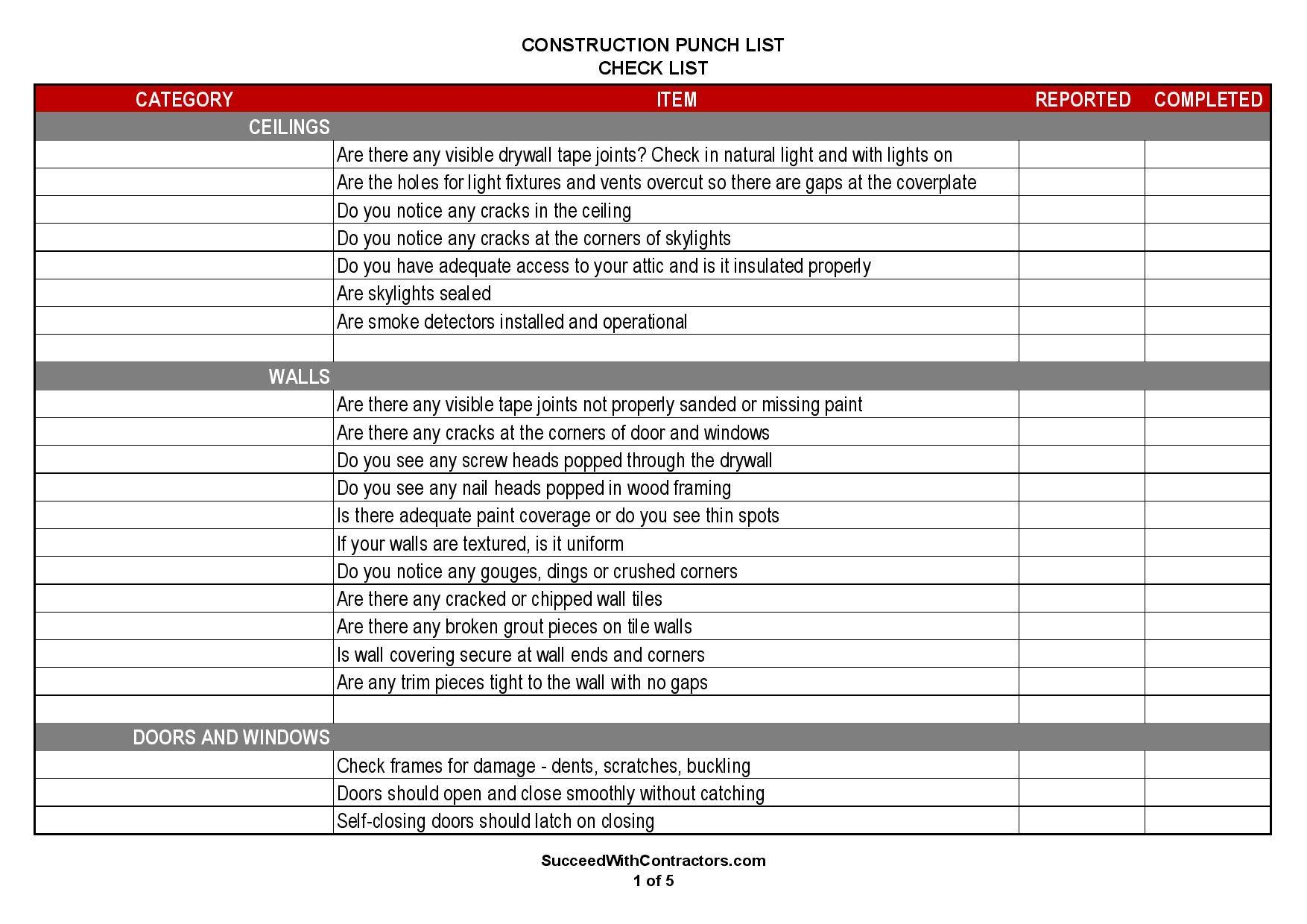 Construction Project Punch List Template