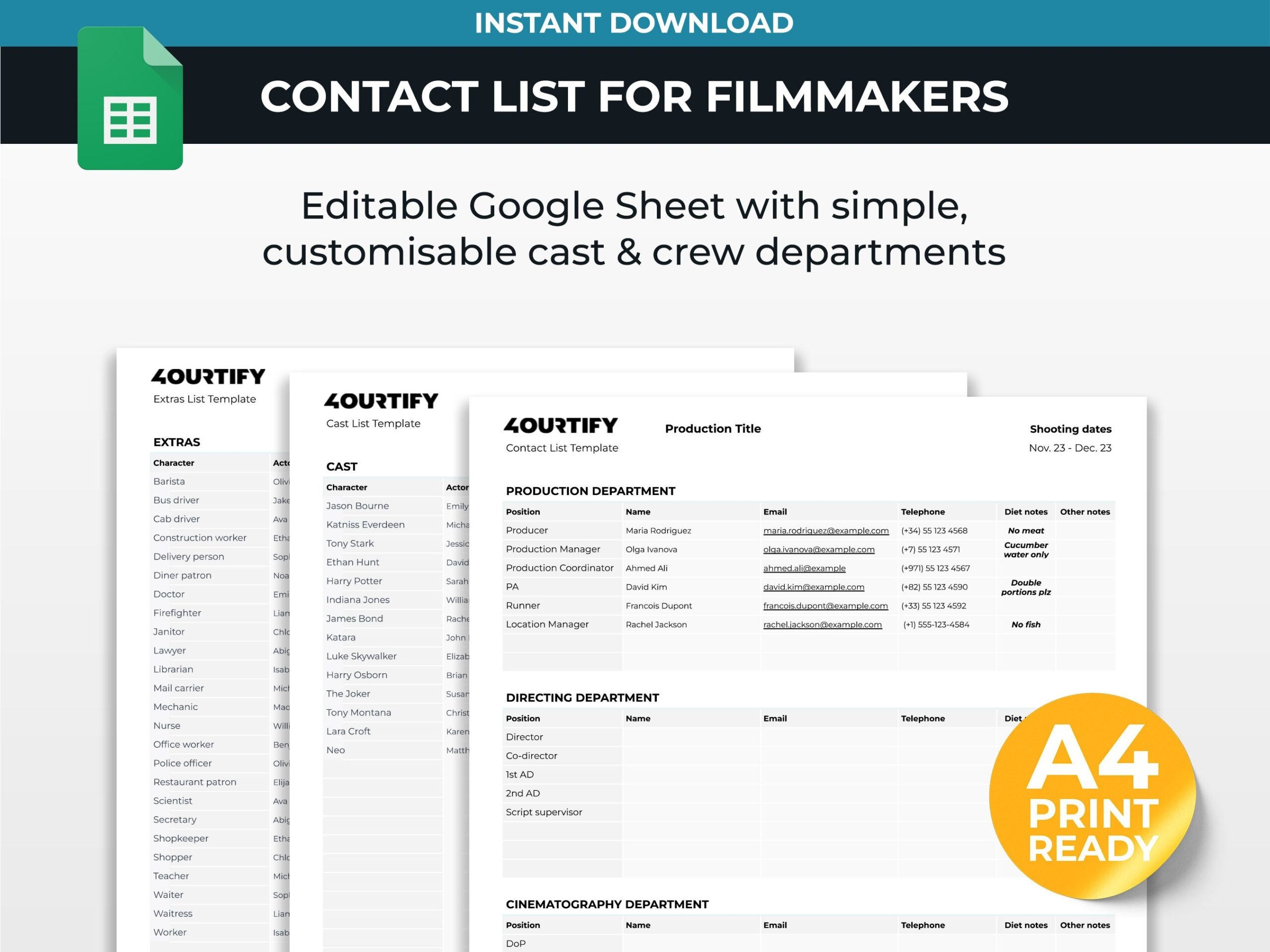 Contact cast U0026 Crew List Template For Filmmakers Google Sheets Etsy UK
