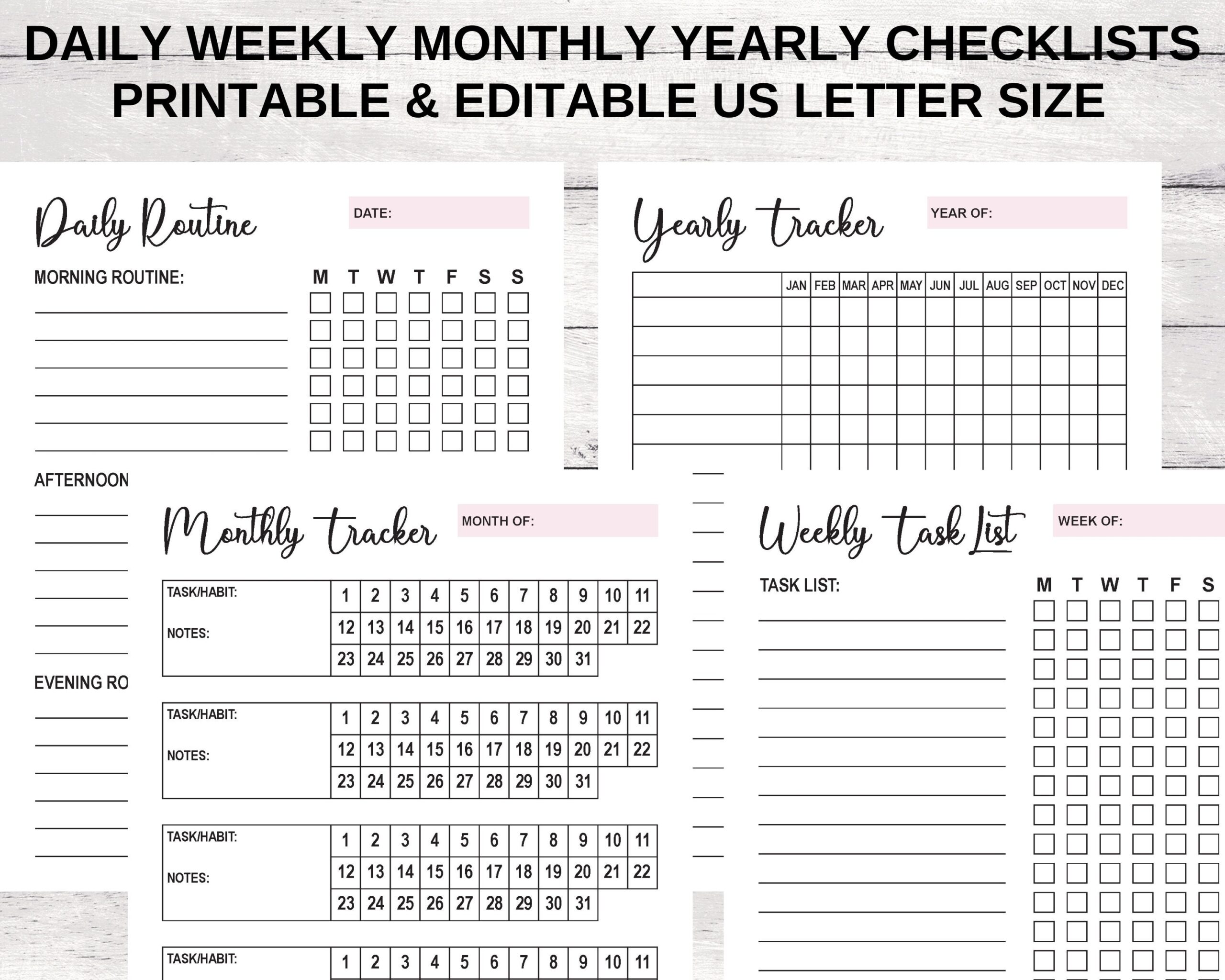 Daily Weekly Monthly Yearly Checklist Templates Daily Routine Weekly Task List Monthly Yearly Tracker Editable To Do Lists Letter Size Etsy