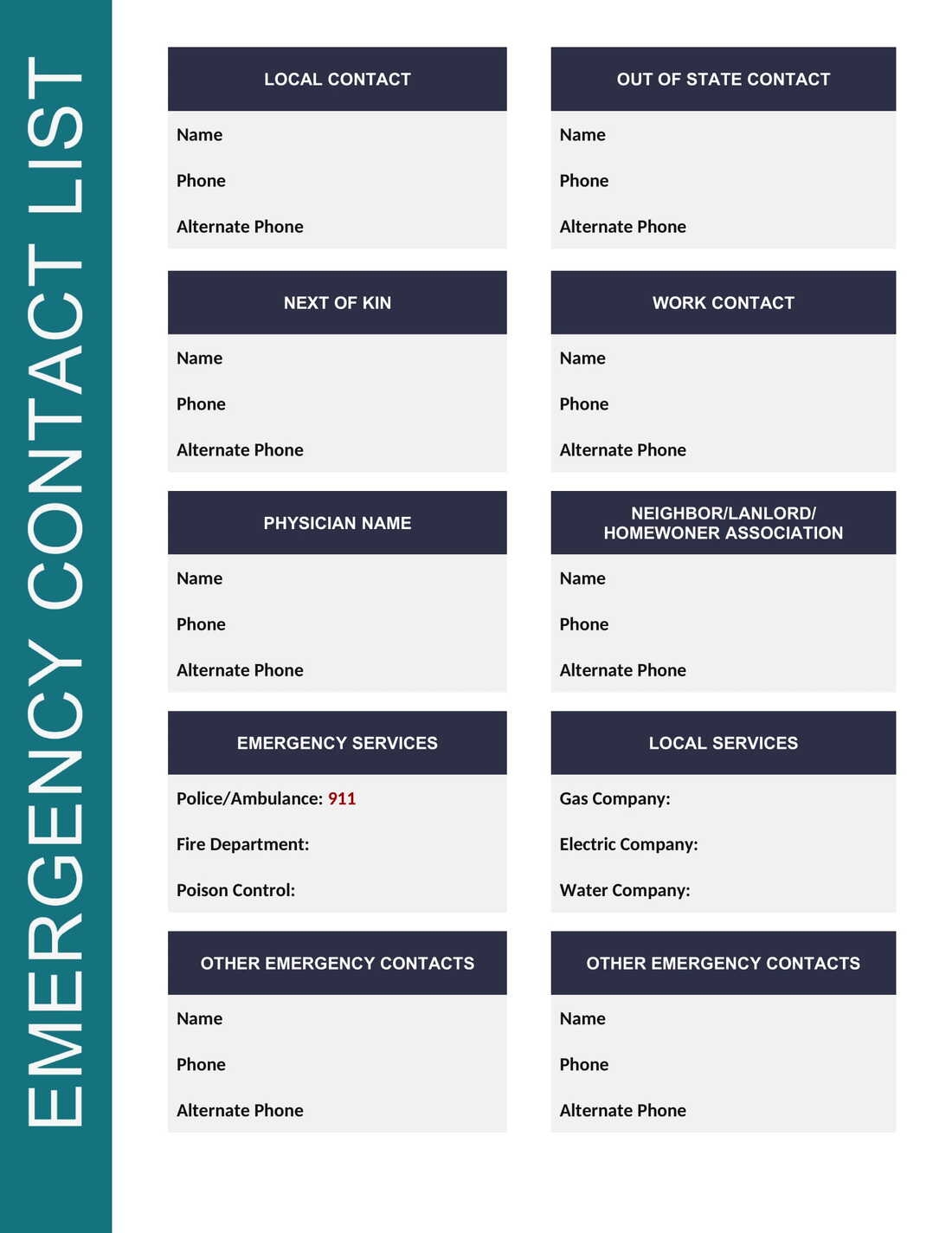 Emergency Phone List Printable PDF Emergency Numbers Sheet Instant Download Etsy UK