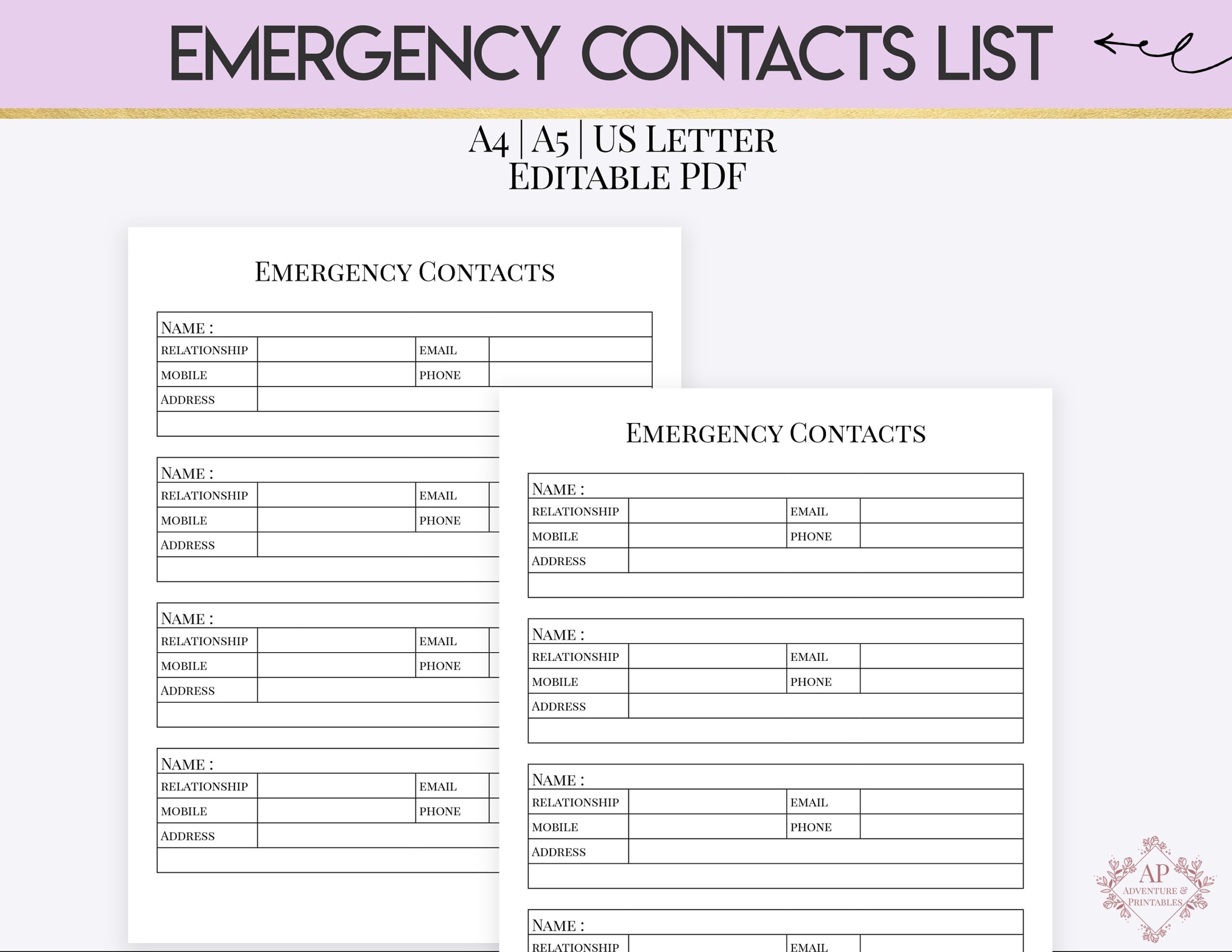 Emergency Contact List Emergency Contact Sheet Home Emergency