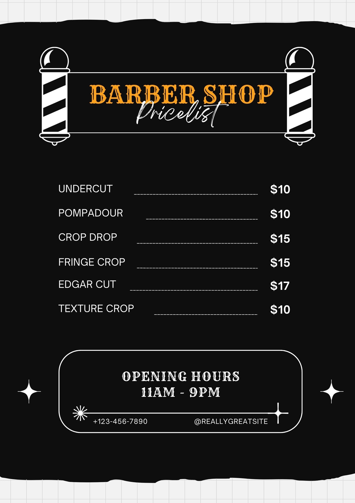 With our template, you can easily add your logo, change colors to match your branding, and update prices to reflect your services. Whether you’re a new barber shop looking to attract clients or an established business wanting to freshen up your pricing, this template is perfect for you.