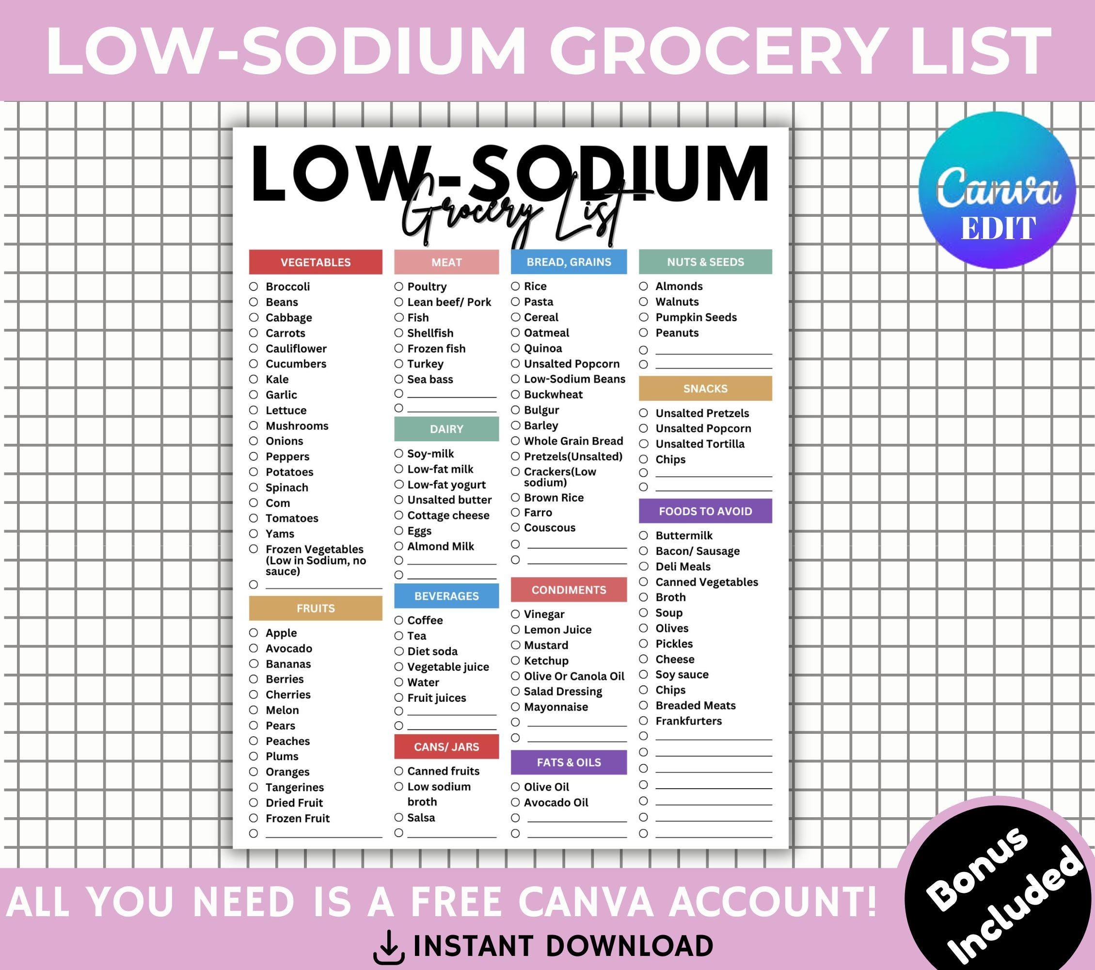 Low Sodium Grocery List Printable High Sodium Foods To Avoid Low Sodium Foods List PDF Low Sodium Diet Low Salt Foods Kidney Disease Diet Etsy