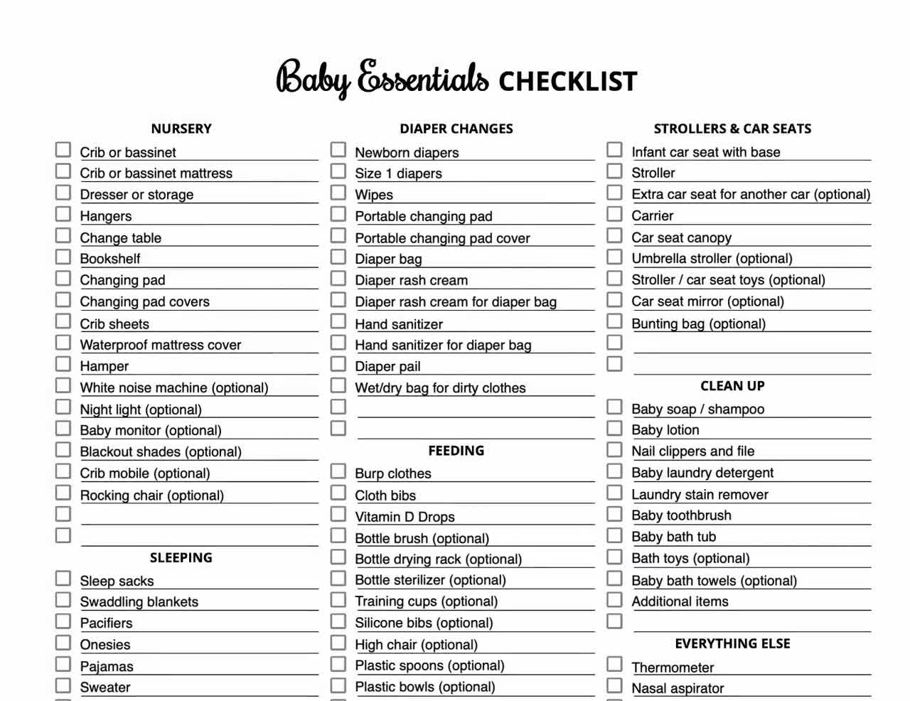 These handy PDFs are easy to download and print, allowing you to check off items as you gather them. From essential baby gear like diapers and wipes to nursery essentials like a crib and changing table, a newborn checklist can help you stay organized and prepared.