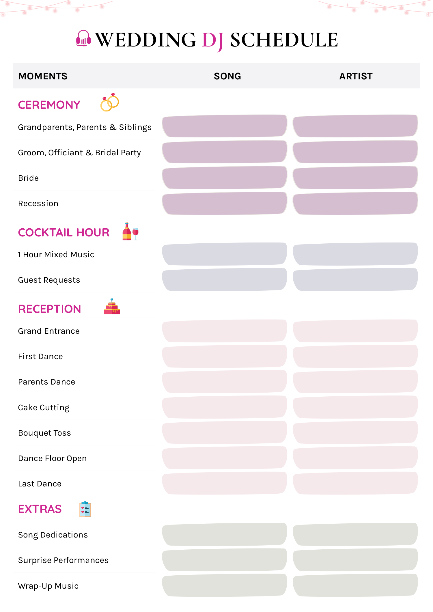 From selecting the perfect playlist to coordinating with your venue, our checklist covers all the essential tasks you need to consider when hiring a DJ for your wedding. With this template, you can easily keep track of all the important details and ensure that your reception is a hit!