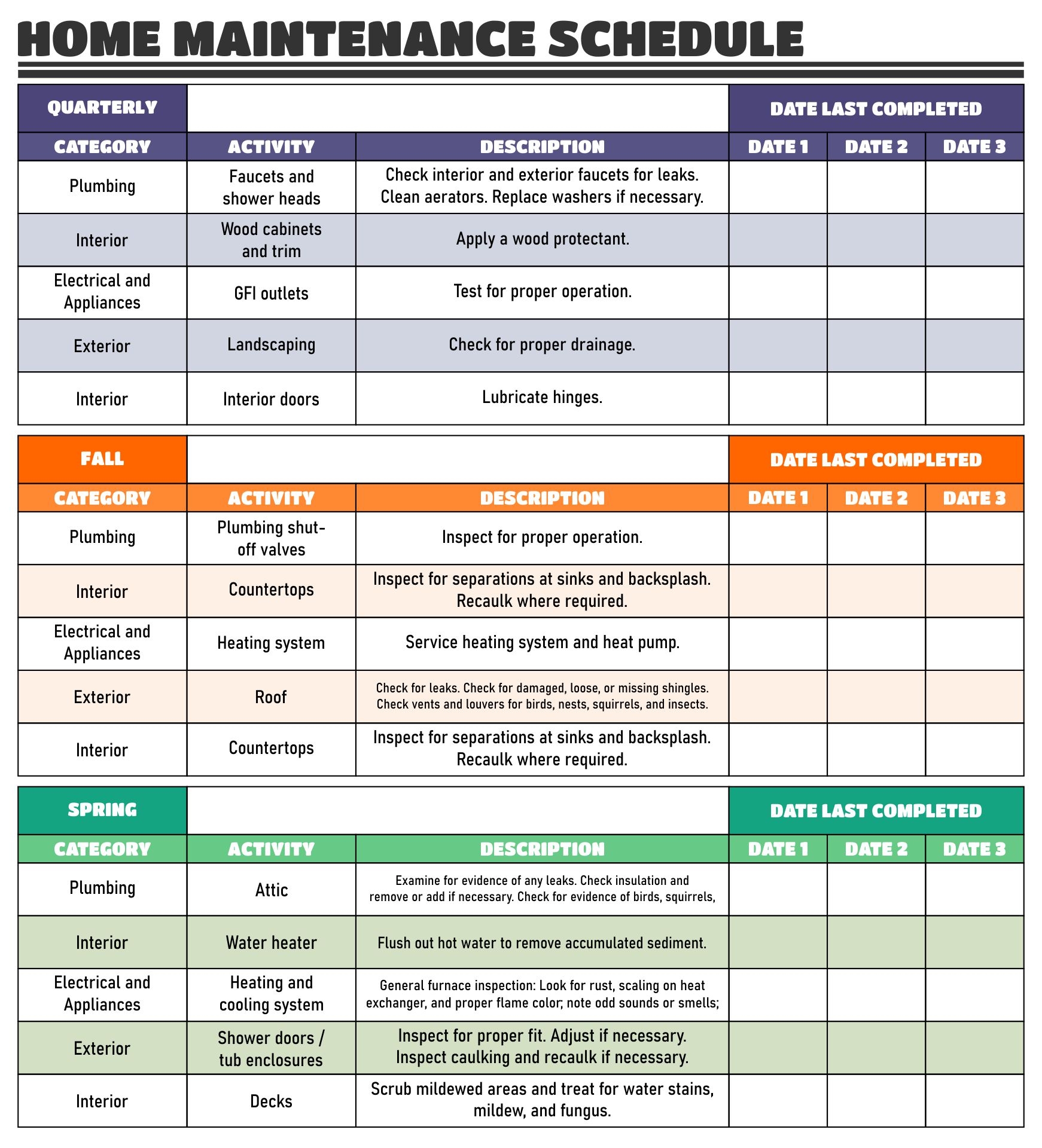 Next, break down the tasks by season and frequency, so you know when each task needs to be completed. For example, cleaning out the gutters might be a bi-annual task, while changing air filters may be monthly.