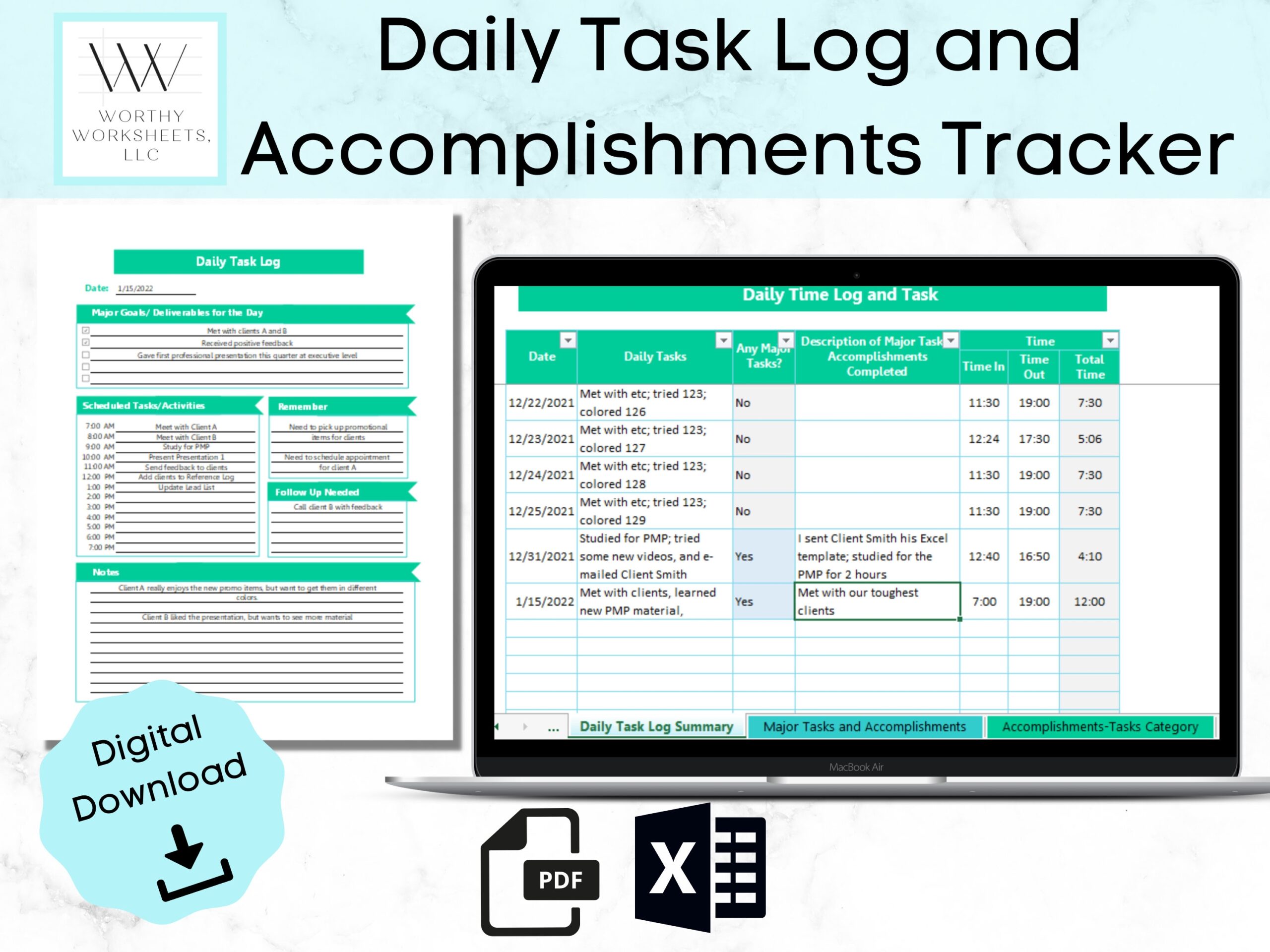 Daily Task Log Accomplishment Tracker Daily Schedule Task Tracker Task List Excel Task List Template Time Log Work Log Time Sheet Etsy
