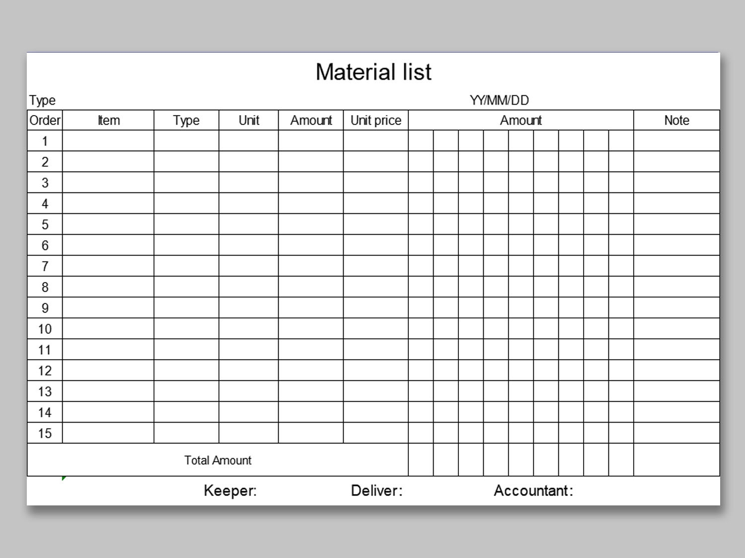 Our user-friendly template allows you to categorize materials, quantities, and even prices. Simply download and print it out, or use it digitally on your computer or tablet. No more scribbling on scraps of paper or trying to remember everything in your head!