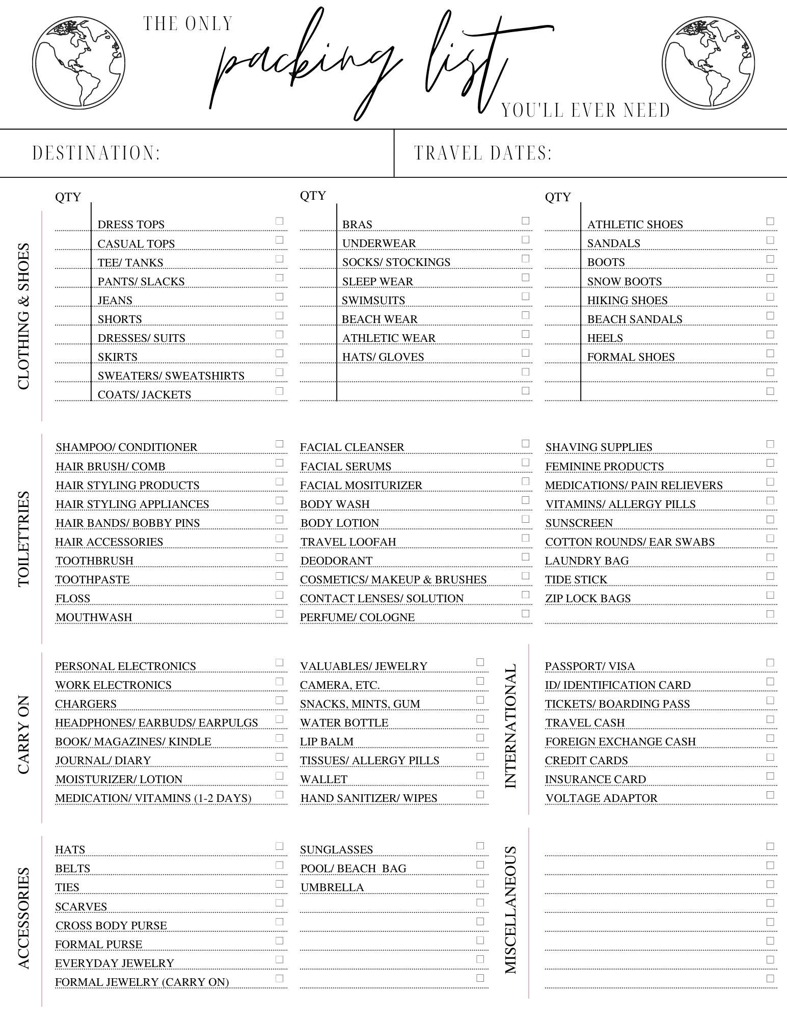 Printable Packing Checklist Blank Vacation Packing List Printable Packing List Template Packing List Downloads Organization Pintables