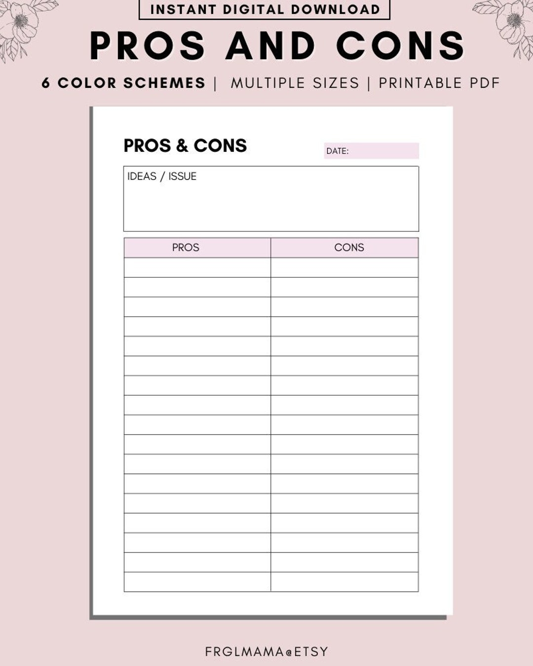 Pros And Cons List Printable List Template Planner Insert Printable Life Planner Printable Instant Download PDF Etsy