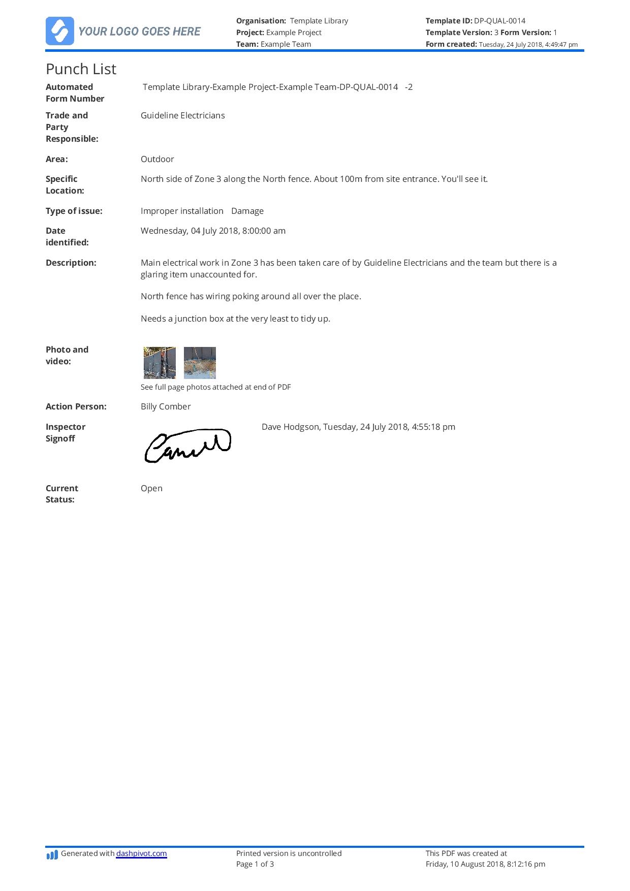 Construction Punch List Template Free PDF Download