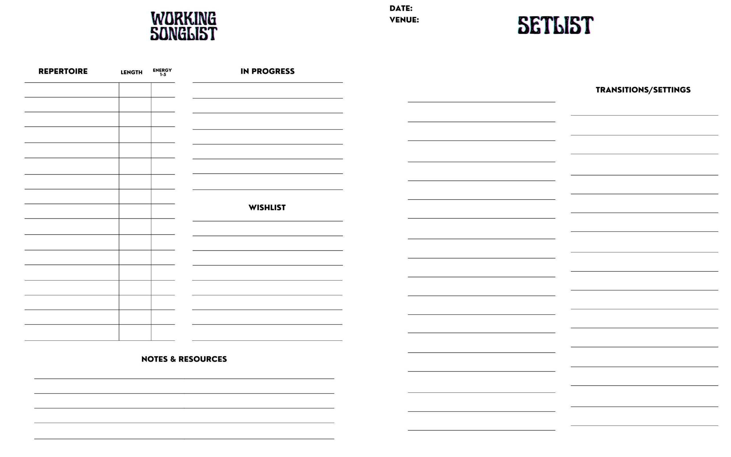 Setlist Builder Gig Setlist Template For Artists And Bands Etsy