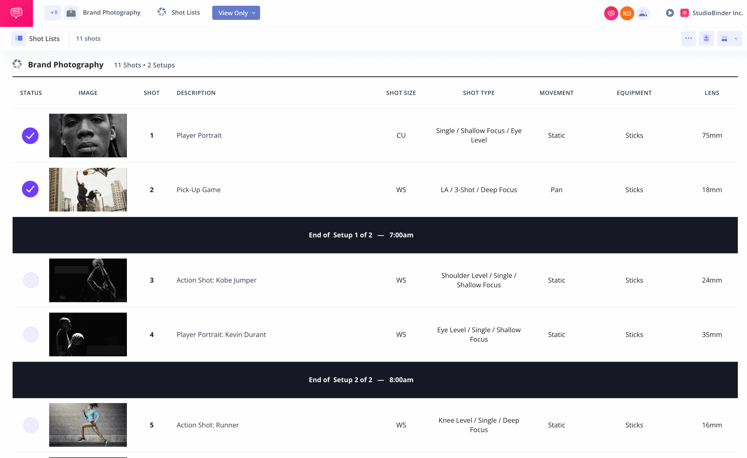 Studiobinder Shot List Template