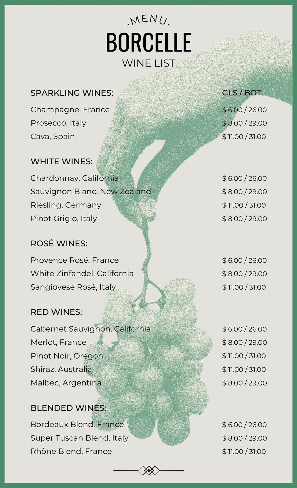 Include relevant information for each wine, such as the name, grape varietal, region, tasting notes, and price. Organize the wines by type or region to make it easy for customers to find what they’re looking for and discover new favorites.